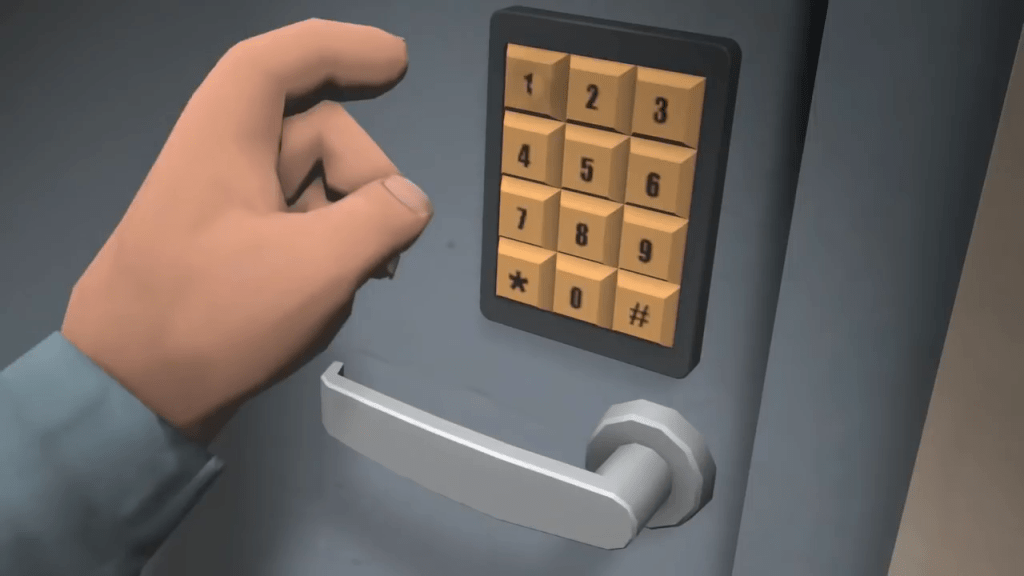 Look closely at the number pad above. See how only the 1 key is worn down? Why would a top-secret mercenary organization have such an easy to guess code? Why did Soldier have to think so hard to remember it? Wait… why didn’t Scout know the code?