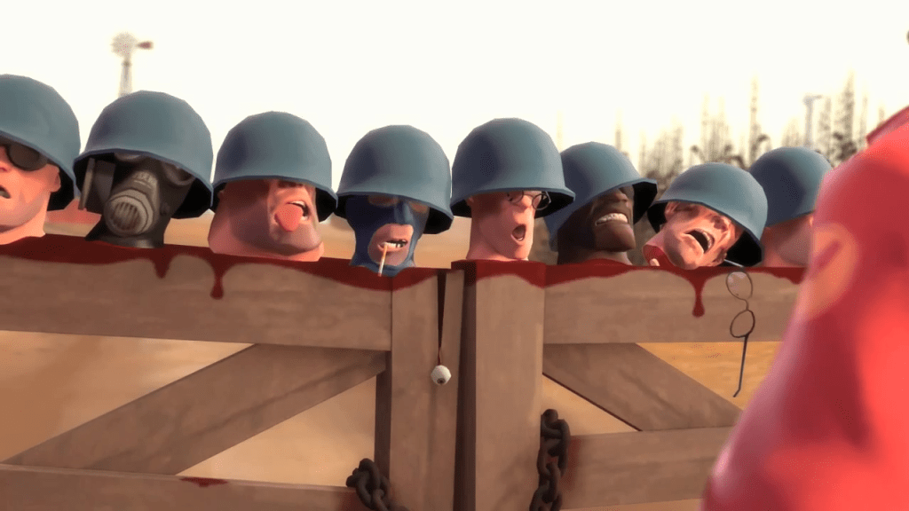 It might seem like a weird time to talk about the animation, but that’s because I want to focus on this headshot scene. Team Fortress 2 is a damn violent game, with people exploding into bits at a moment’s notice. But having Spy’s brain matter and skull fragments fly everywhere is just… disgusting and visceral, even by this universe’s standards.